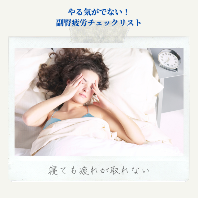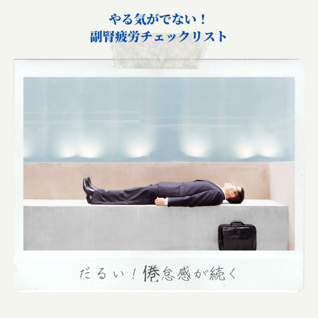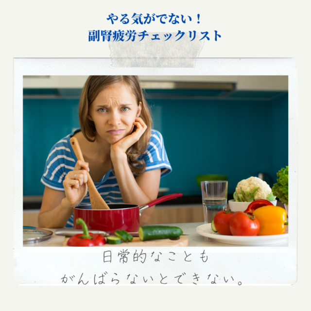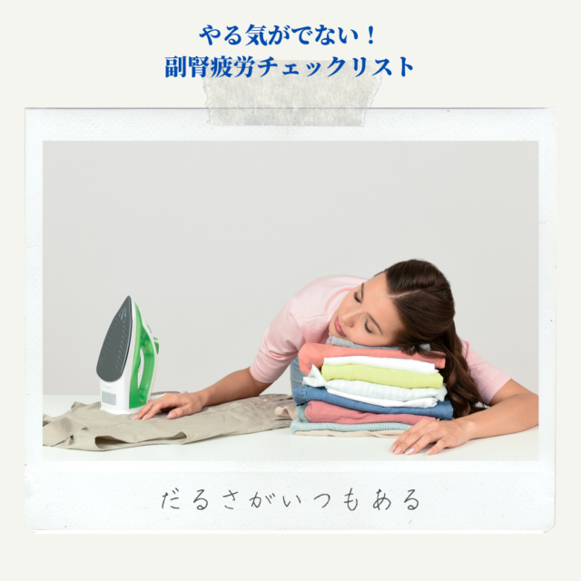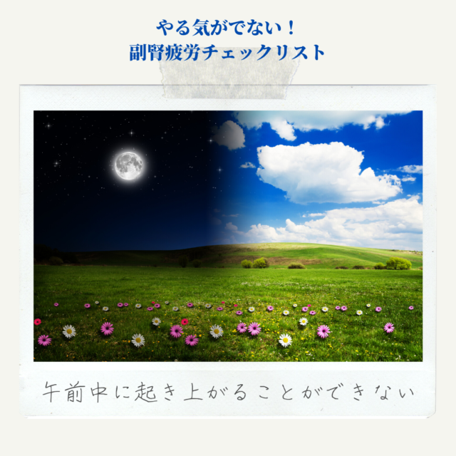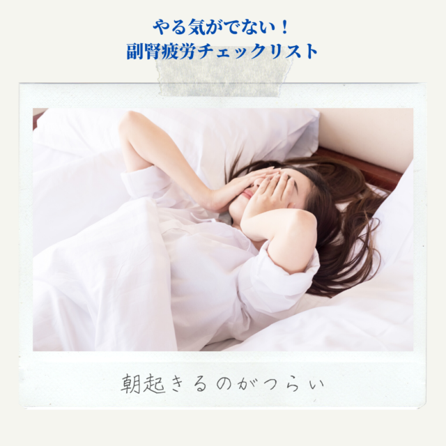 ストレスや食生活、環境などにより副腎の機能が低下することで、主にコルチゾールの分泌が低下して起き上がれない、やる気がでないなどの症状が現れます。