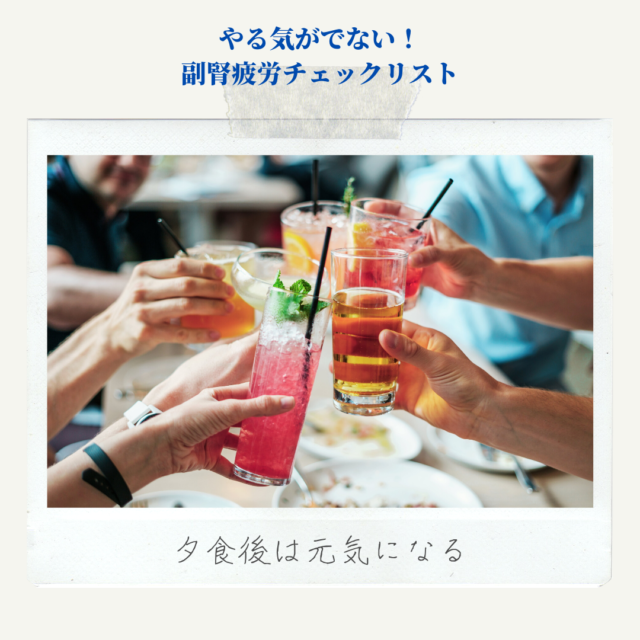 夕食後は元気になり、食欲が出て(食欲がとまらない)、お酒も飲める。