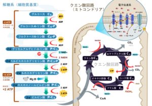 カラダのエネルギーの源「ATP(アデノシン三リン酸)」は糖を原料とし、ミトコンドリアで作られています。この時にマグネシウムが足りないとエネルギー代謝酵素がうまく働けずにエネルギーの源「ATP(アデノシン三リン酸)」が作れないのです。